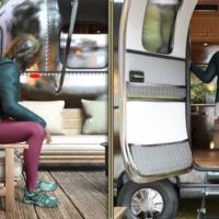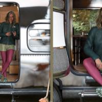 Each pose reflects those golden-hour moments when the day winds down: leaning against the van after a long drive, sitting by the fire with tired but content posture, stretching legs toward the warmth of the flames, or simply gazing at the horizon as the sun melts into the landscape.