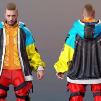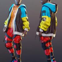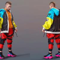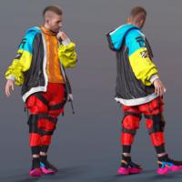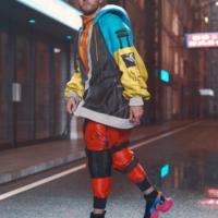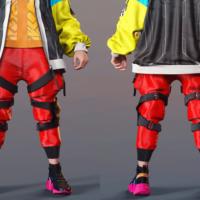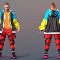 This outfit includes: a loose-fitting jacket, pants with knee pads, an inner top, and colorful sneakers.