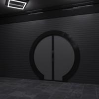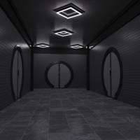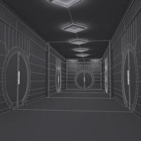 Dystopian Hallway Scene features a detailed sci-fi minimalist theme interior hallway with round-shaped sliding doors, unique ceiling lights, Optimized for Studio with Iray.